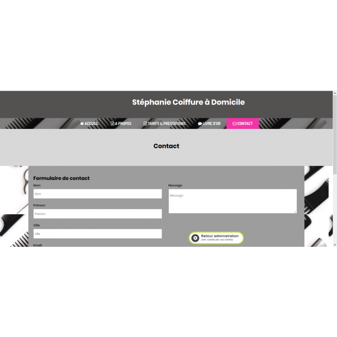 la page d'accueil avec 4 photos sous forme de diaporama défilant,votre présentation, les tarifs,la page contact, le livre d'or